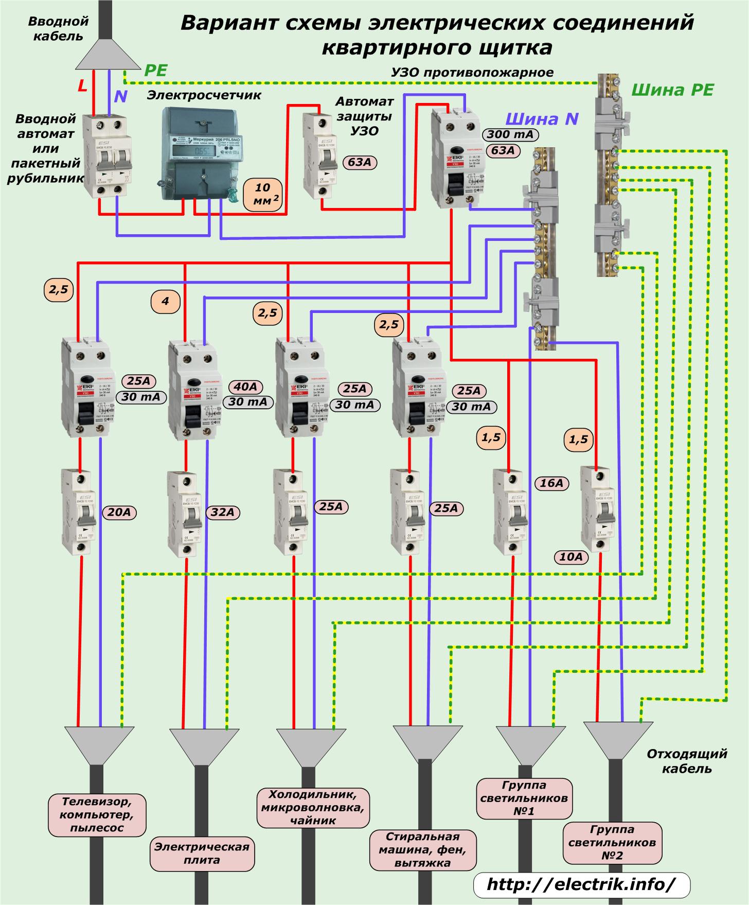 Fázové a nulové vodiče sú pripojené k ističu vstupného obvodu alebo prepínaču dávky (prepínač) a ochranný vodič PE je okamžite odoslaný na jeho zbernicu. S tým rozvedie všetkých spotrebiteľov pomocou žíl odchádzajúcich káblov.
