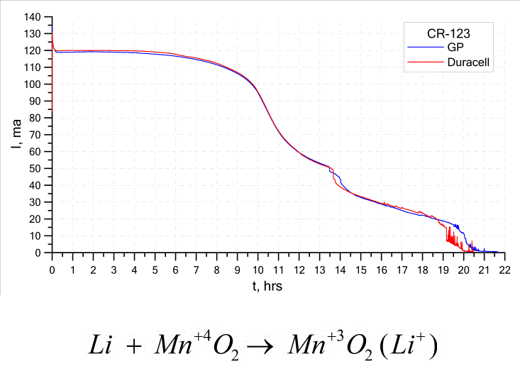 Graf vyššie ukazuje krivky vybíjania pre dve lítiové batérie od dvoch populárnych výrobcov. Počiatočný prúd bol 120 mA (na rezistor rádovo 24 Ohmov).